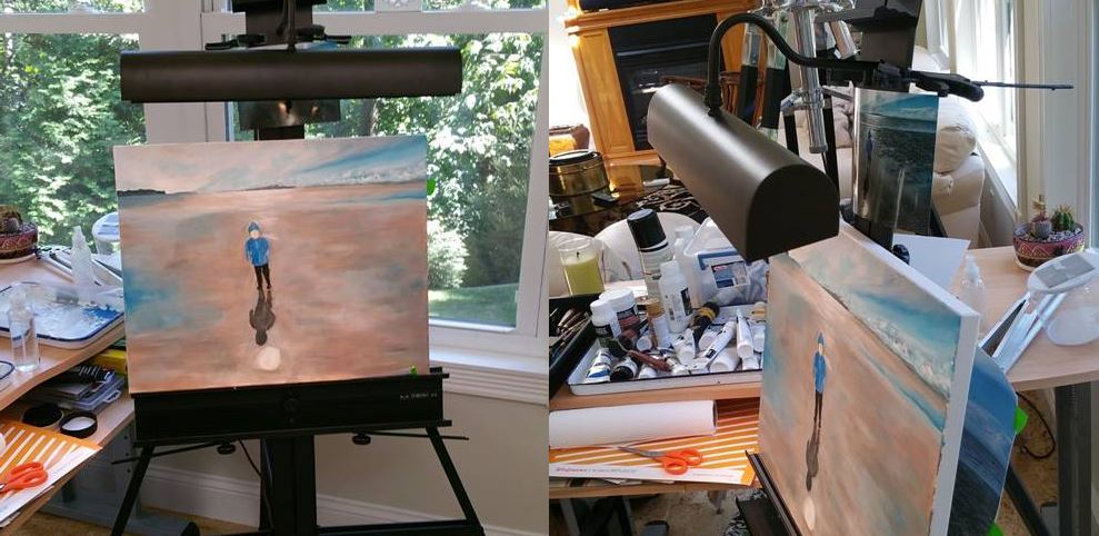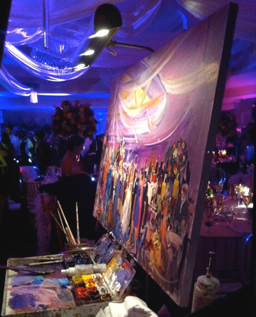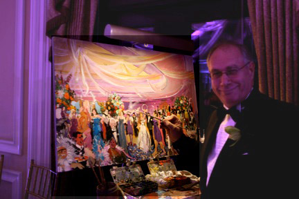 This artist who is know as the "wedding painter". It's probably the best gig for a portrait painter as he is booked 6-9 months out. He said he arrives at the wedding and paints the room before the guests arrive and then fills in the rest as the night goes on. He contacted me about building a FineArtLight "easel" light that would light his paintings as he paints and not blind the wedding party behind his canvas like his Luxor lamp did.